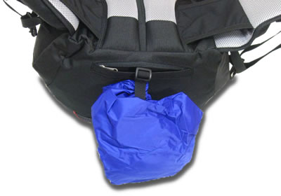 上下2箇所をゴムバンドでしっかりと固定できるので、雨の日でも安心です。レインカバーはボトムのポケットに収納。